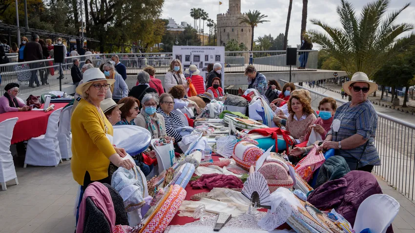 La cita se celebra en el paseo Marqués de Contadero de la capital andaluza, organizado por la Asociación Encajeras La Giralda, en coordinación con el Ayuntamiento de Sevilla a través de la Delegación de Igualdad, Participación Ciudadana y Coordinación de Distritos.